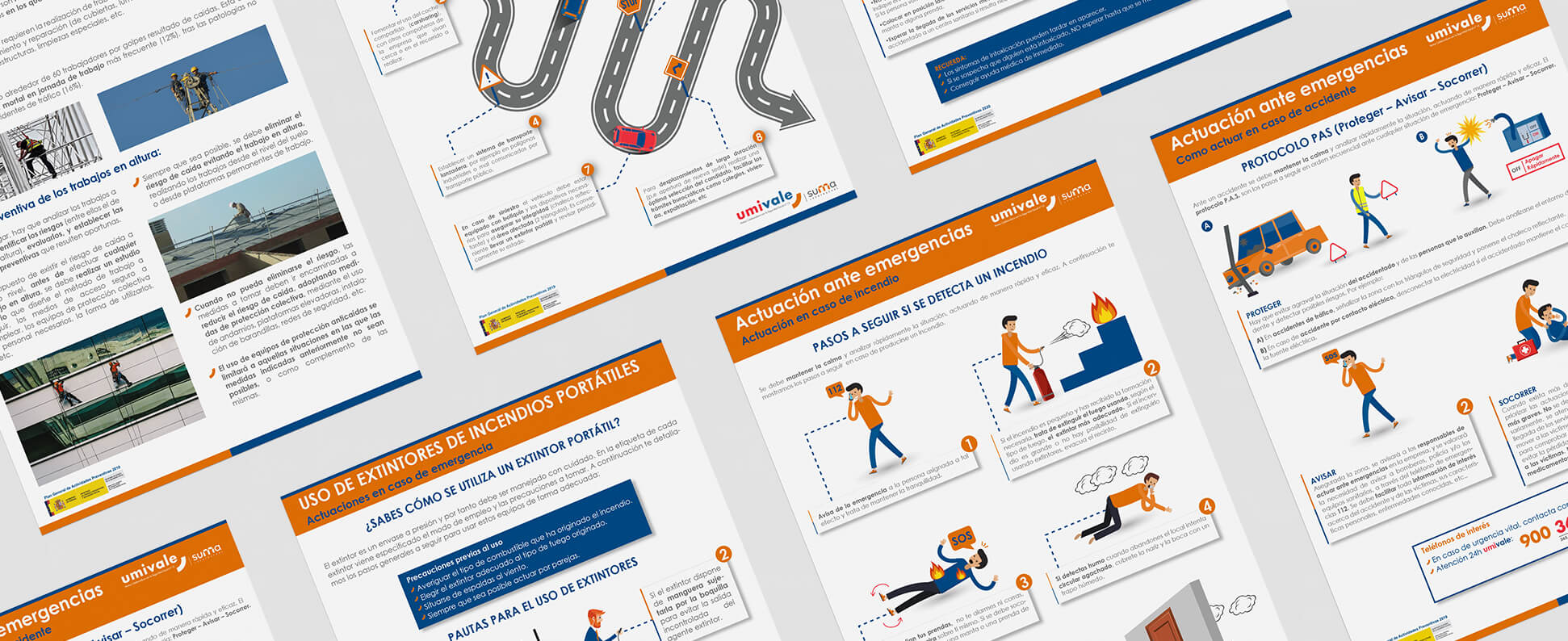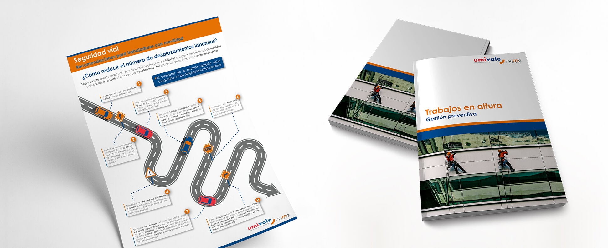 Colección de folletos y guías elaborados sobre prevención de riesgos laborales, para el departamento de la mutua Umivale, en diferentes ámbitos (Seguridad vial, Trabajos en oficinas, Riesgo químico, etc.)